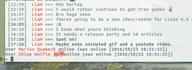 Features that aren’t supported in telegram-cli include stickers, emoji, custom backgrounds, and other visual fluff.