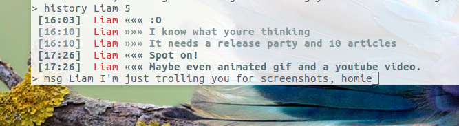E.g.: history Liam 10 will print the 10 most recent messages in my conversation with Liam: